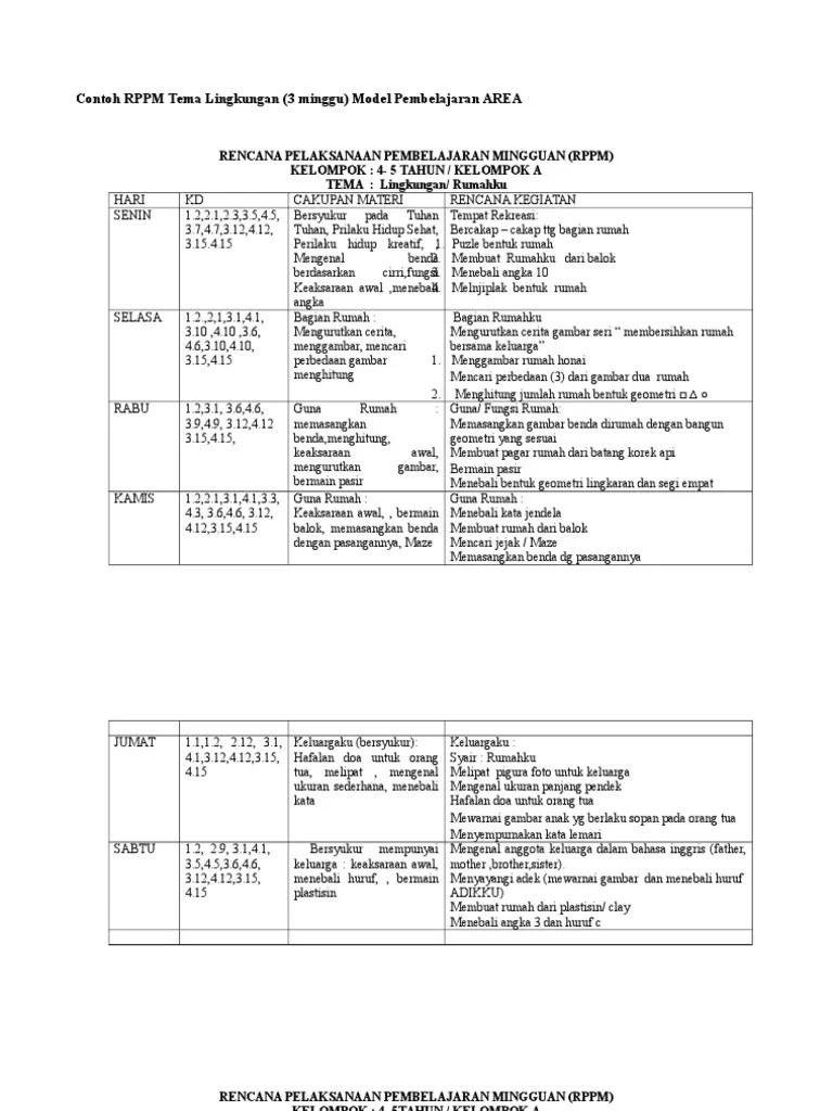 Rencana pelaksanaan pembelajaran mingguan (rppm). Rencana pelaksanaan pembelajaran mingguan atau rppm adalah rencana kegiatan yang disusun sebagai acuan pembelajaran selama satu minggu. Harga 330000/paket berat buku 1 paket = 2 kg. Disampaikan melalui kegiatan bermain yang berbeda di setiap model pembelajaran sentra / area / kegiatan sudut. Contoh rppm tk ra paud .
